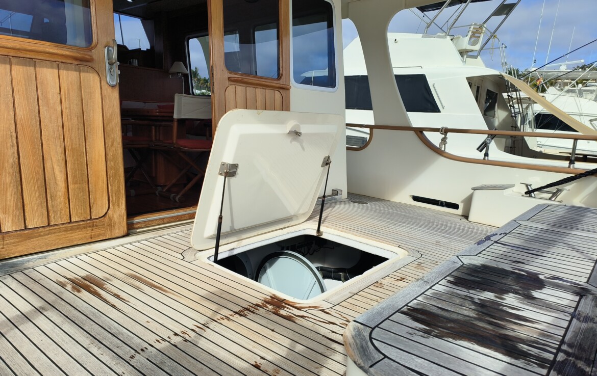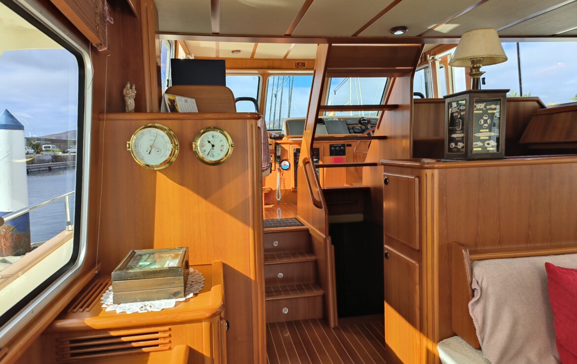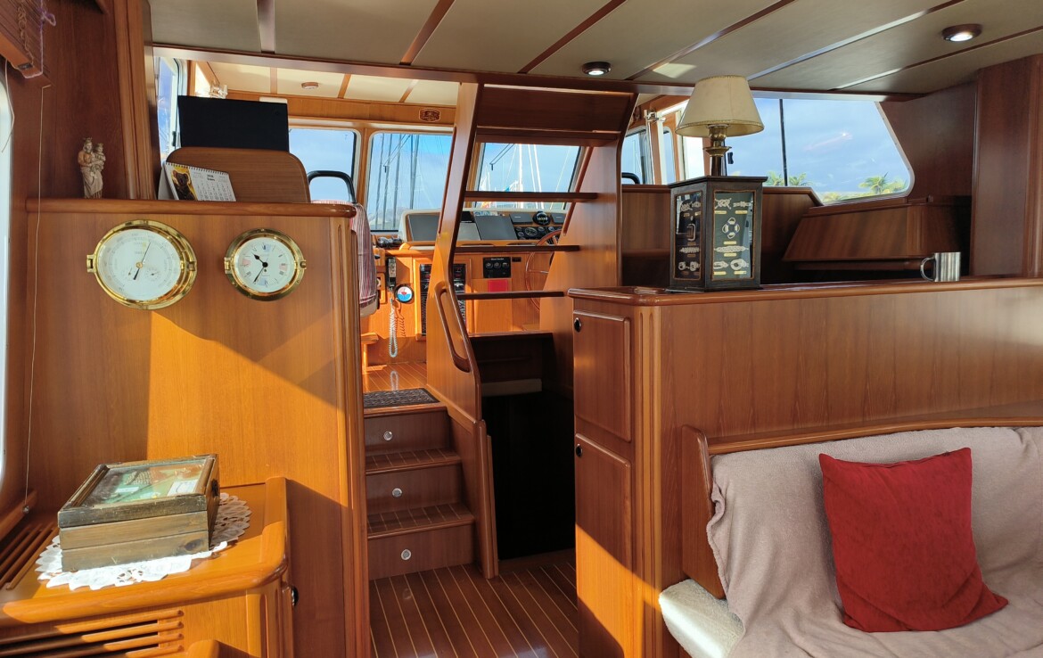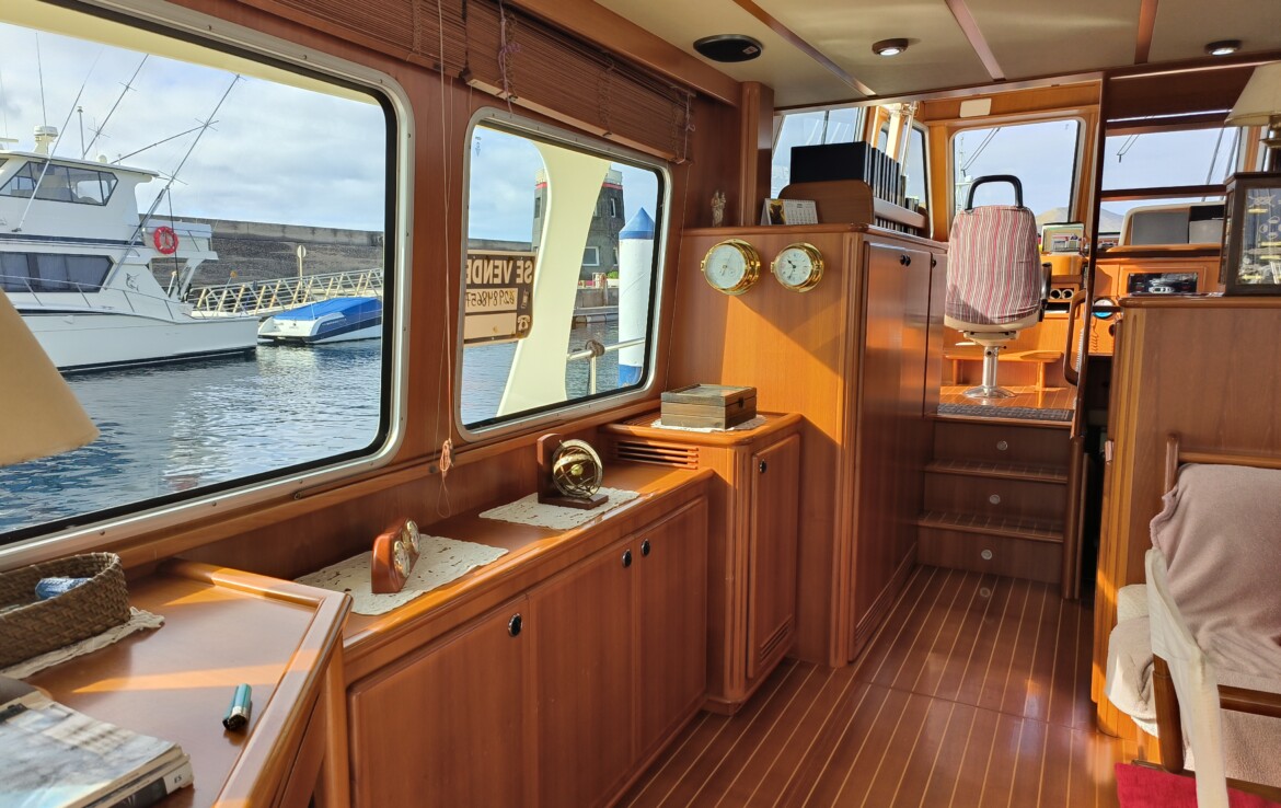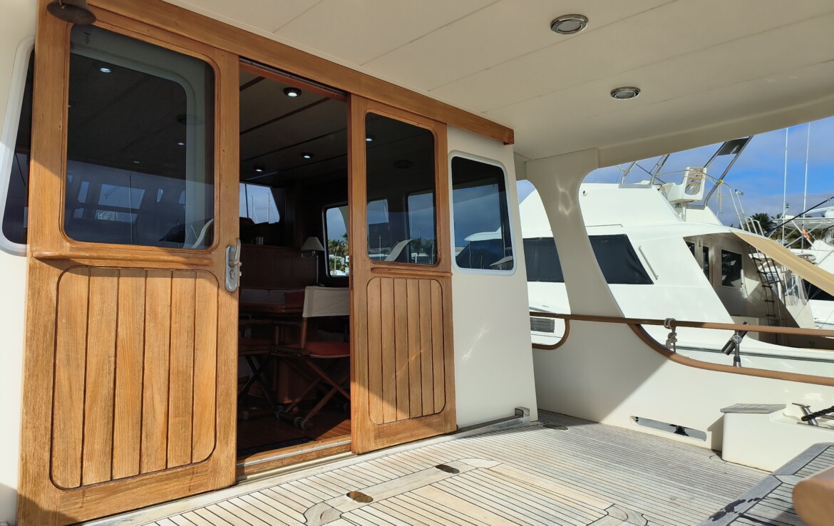 Her exterior living spaces include a wonderful al fresco flybridge, perfect for relaxed cruising and entertaining with panoramic views. Inside, the yacht features beautiful handcrafted teak joinery, giving the interior a classic warmth and elegance. Practical pantograph side doors provide quick and secure access from the pilothouse directly onto the side decks, greatly assisting with docking manoeuvres — especially when operating short-handed or even single-handed.