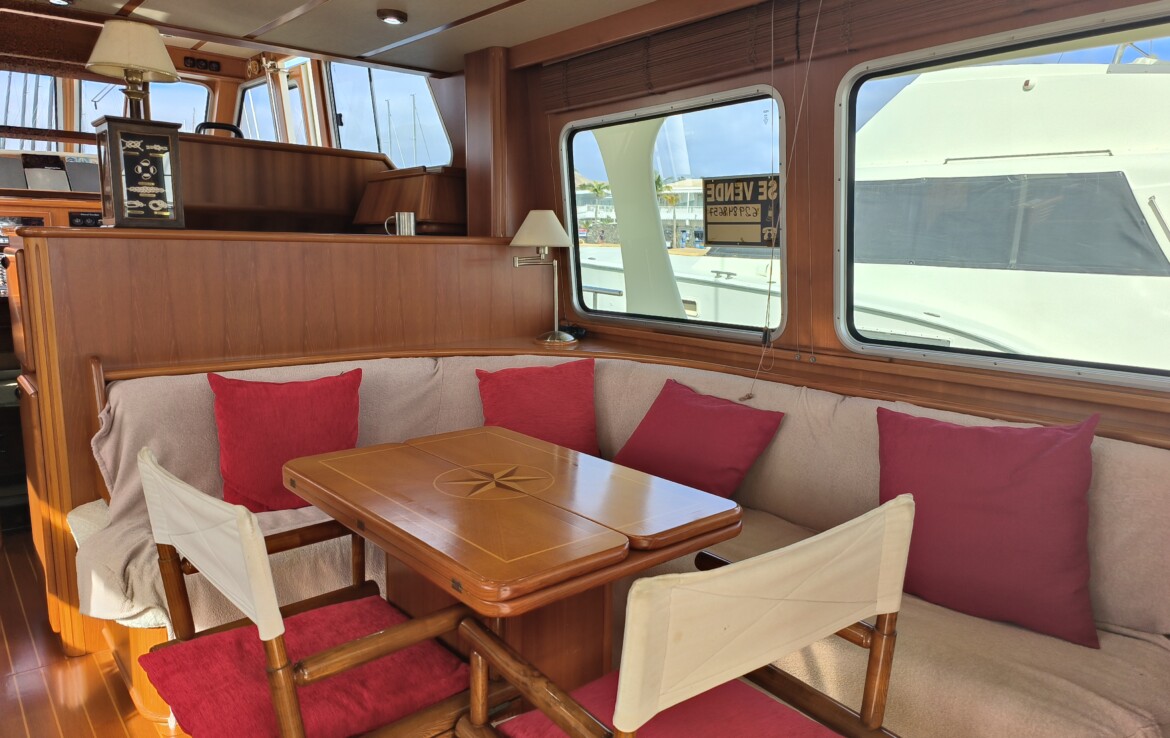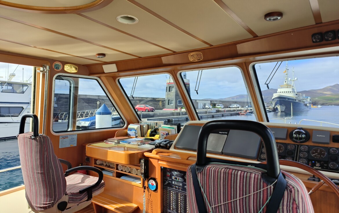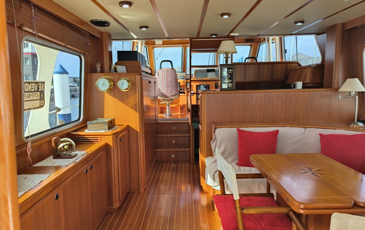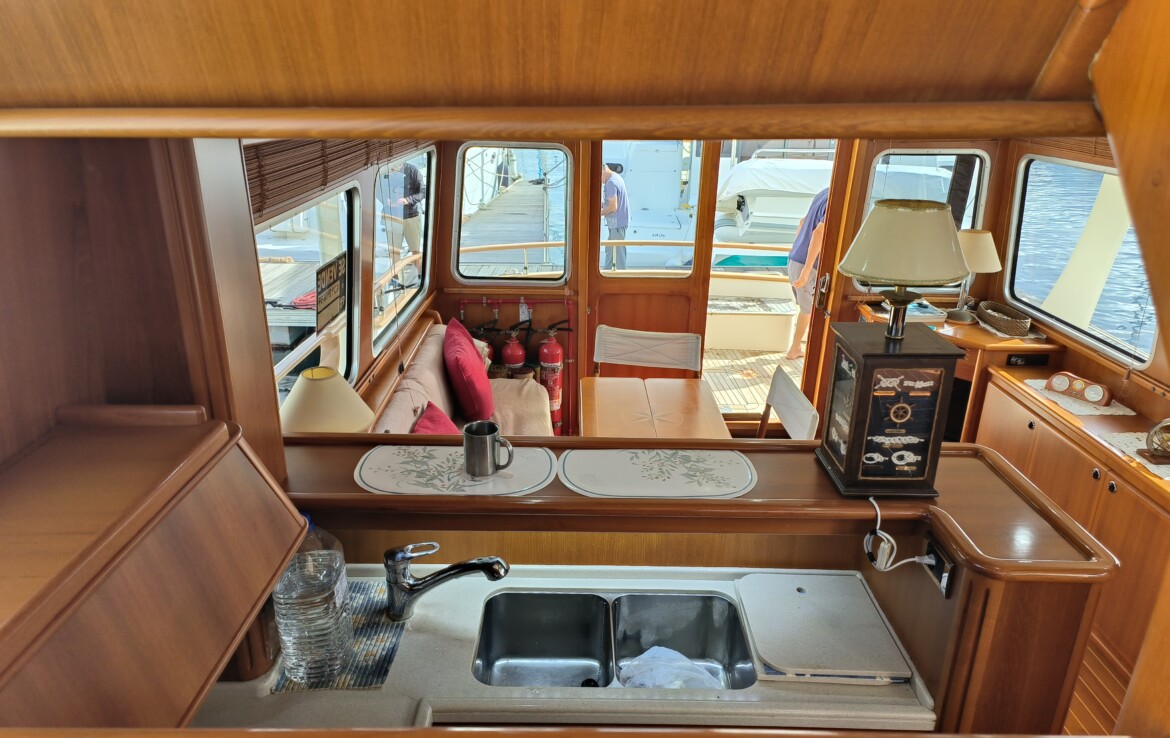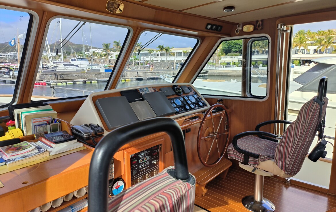 Her exterior living spaces include a wonderful al fresco flybridge, perfect for relaxed cruising and entertaining with panoramic views. Inside, the yacht features beautiful handcrafted teak joinery, giving the interior a classic warmth and elegance. Practical pantograph side doors provide quick and secure access from the pilothouse directly onto the side decks, greatly assisting with docking manoeuvres — especially when operating short-handed or even single-handed.